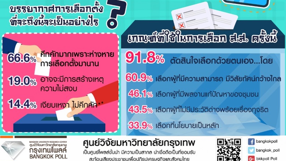 กรุงเทพโพลล์ โดยศูนย์วิจัยมหาวิทยาลัยกรุงเทพ สำรวจความคิดเห็นประชาชนอายุ 18-24 ปีที่อาศัยในเขตกรุงเทพมหานคร จำนวน 14 เขต จากทั้งหมด 50 เขต ได้แก่ จตุจักร ทุ่งครุ ธนบุรี บางกะปิ บางเขน บางซื่อ บางนา ปทุมวัน พระนคร ภาษีเจริญ ลาดกระบัง วัฒนา สวนหลวง สาทร และปริมณฑล 2 จังหวัด ได้แก่ ปทุมธานี สมุทรปราการ จำนวน 1,202 คน ระหว่างวันที่ 7-12 พฤศจิกายน 2561 เรื่อง “วัยใสจะไปเลือกตั้ง” พบว่า ส่วนใหญ่ร้อยละ 85.8 จะใช้ช่องทางสื่อสังคมออนไลน์ เช่น facebook youtube ติดตามข่าวสารการเลือกตั้งและข่าวเกี่ยวกับพรรคการเมือง รองลงมาร้อยละ 36.5 จะติดตามผ่านช่องทางทีวี และร้อยละ 20.8 จะติดตามผ่านเว็บไซต์
