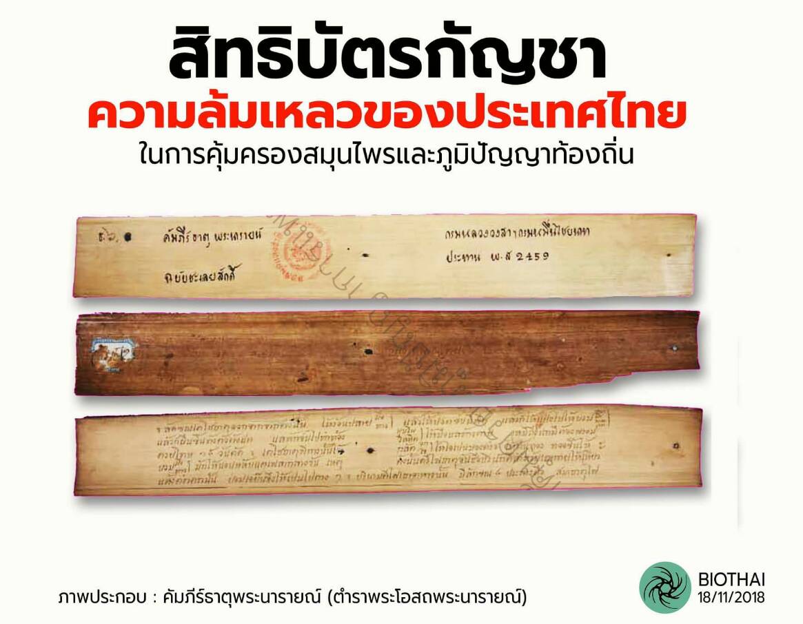 สำนักข่าวไทย18 พ.ย.- เพจ มูลนิธิชีววิถี (BIOTHAI) รายงานว่ากรมการแพทย์แผนไทยฯ ได้รวบรวมตำรับยาที่เข้ากัญชาพบว่ามีมากถึง 93 ตำรับ รวมทั้งตำราพระโอสถพระนารายณ์ ซึ่งมีอายุเก่าแก่มานานกว่า 300 ปี ขณะที่กรมทรัพย์สินทางปัญญาของไทย กลับละเลยการปกป้องทรัพยากรและภูมิปัญญาท้องถิ่น