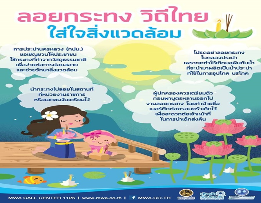 นางราชิรัช อุทาโย ผู้อำนวยการฝ่ายสื่อสารองค์กร การประปานครหลวง (กปน.) กล่าวว่า ในเทศกาลลอยกระทง ซึ่งตรงกับวันพฤหัสบดีที่ 22 พฤศจิกายน 2561 กปน.ขานรับแนวคิดของรัฐบาล “ลอยกระทงปลอดภัย สืบสานวัฒนธรรมไทย ใส่ใจสายน้ำและสิ่งแวดล้อม” จึงขอความร่วมมือประชาชนงดลอยกระทงในคลองประปา เพื่อป้องกันไม่ให้เกิดอุบัติเหตุจากการพลัดตกน้ำ จนอาจเกิดความสูญเสียทั้งชีวิตและทรัพย์สิน และสงวนรักษาน้ำดิบในคลองประปาให้มีคุณภาพดีเหมาะแก่การนำไปผลิตน้ำประปาให้บริการประชาชนกว่า 10 ล้านคนในกรุงเทพมหานคร นนทบุรี และสมุทรปราการ นอกจากนี้ การลอยกระทงในคลองประปา ยังผิด พ.ร.บ.รักษาคลองประปา พ.ศ.2526 ซึ่งมีโทษปรับไม่เกิน 2,000 บาท หรือจำคุกไม่เกิน 1 เดือน หรือทั้งจำทั้งปรับอีกด้วย