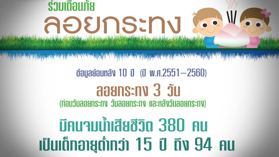 ปลัดกระทรวงสาธารณสุข กล่าวต่อว่า จากการวิเคราะห์ข้อมูลมรณบัตรของกองยุทธศาสตร์และแผนงาน โดยกรมควบคุมโรค ย้อนหลัง 10 ปี ตั้งแต่ปี 2551–2560 ช่วงเทศกาลลอยกระทง 3 วัน คือก่อนวันลอยกระทง วันลอยกระทงและหลังวันลอยกระทง มีคนจมน้ำเสียชีวิตสะสม 380 คน เป็นเด็กอายุต่ำกว่า15 ปีถึง 94 คน คิดเป็นร้อยละ24.7 เฉพาะวันลอยกระทงวันเดียวมีคนจมน้ำเสียชีวิตสะสมสูงถึง 145 คน โดยเด็กอายุต่ำกว่า 15 ปีจมน้ำเสียชีวิตสูงถึง 43 คน คิดเป็นร้อยละ29.7 เฉลี่ยวันละกว่า 4 คน ซึ่งมากกว่าในช่วงวันปกติ 2 เท่าตัวและในปี 2560 แนวโน้มการเสียชีวิตลดลงทั้งในกลุ่มเด็กและผู้ใหญ่ เป็นชายมากกว่าหญิงประมาณ 2 เท่าตัว มากที่สุดคือเด็กกลุ่มอายุ 5-9 ปี ที่น่าสนใจคือยังคงมีเด็กชายอายุ 8 ปีที่จังหวัดอยุธยา จมน้ำเสียชีวิตจากการว่ายน้ำลงไปเก็บเงินในกระทง