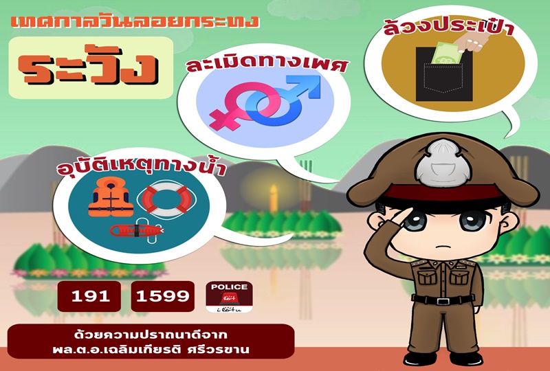 กรุงเทพฯ 20 พ.ย.- สำนักงานตำรวจแห่งชาติCampaign เด็ดของสำนักงานตำรวจแห่งชาติ ช่วงวันลอยกระทงในปีนี้ โดยย้ำเข้มมาตรการ 3ห้าม 3ไม่ 3ควร 3 ระวัง
