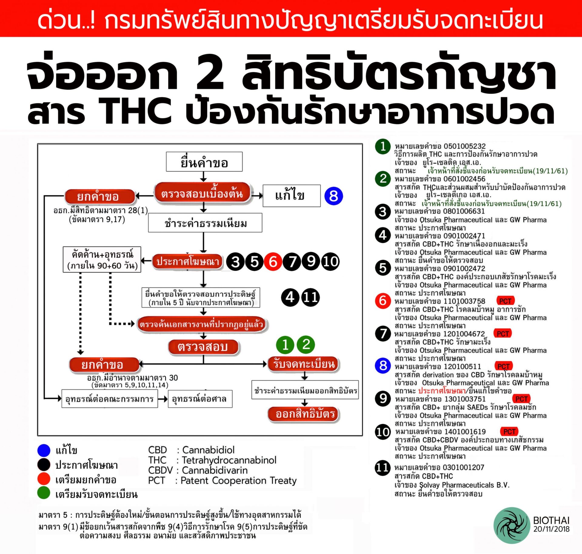 จากเพจมูลนิธิชีววิถี (BIOTHAI) ระบุว่า ในขณะที่นายสนธิรัตน์ สนธิจิรวงศ์ รัฐมนตรีว่าการกระทรวงพาณิชย์ ได้แถลงว่าจะยกเลิกสิทธิบัตรกัญชาจำนวน 1 คำขอ แต่จากการตรวจสอบล่าสุด ไบโอไทยพบว่ากรมทรัพย์สินทางปัญญาเตรียมรับจดทะเบียนสิทธิบัตรจำนวน 2 สิทธิบัตร โดยเมื่อวานนี้ (19/11/2561)ในเว็บไซต์ของกรมฯ ได้อัพเดทข้อมูลคำขอสิทธิบัตรกัญชาของบริษัท ยูโร-เซลตีเกอ เอส.เอ. คำขอที่ 0601002456 (ชื่อผลิตภัณฑ์/สิ่งประดิษฐ์ : ส่วนผสมเชิงเภสัชกรรมที่ออกฤทธิ์ของแคนนาบินอยด์สำหรับรูปแบบขนาดยาที่ถูกปรับปรุง) และคำขอที่ 0501005232 (ชื่อผลิตภัณฑ์/สิ่งประดิษฐ์ : วิธีการสำหรับการทำให้ทรานส์-(-)- เดลตา9 – เตตราไฮโดรแคนนาบินอล และทรานส์-(+)- เดลตา9 – เตตราไฮโดรแคนนาบินอล บริสุทธิ์)