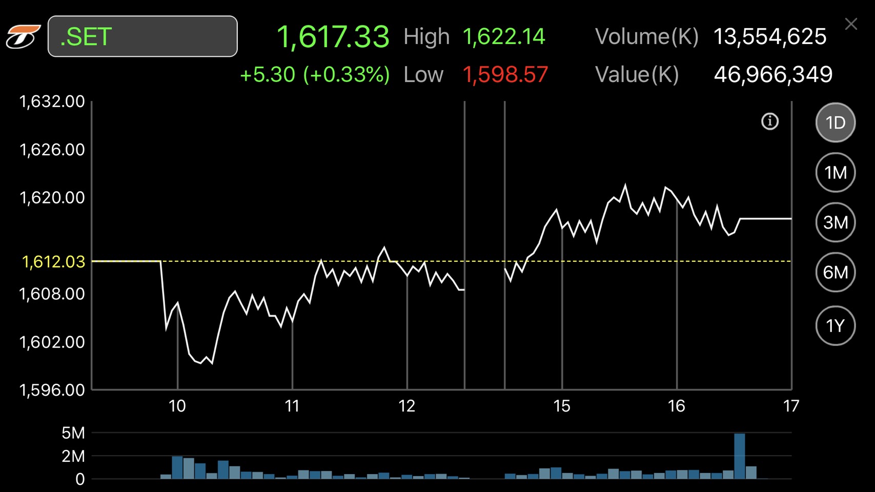 การซื้อขายหุ้นวันนี้ ดัชนีหุ้นไทยเคลื่อนไหวทั้งในแดนบวก – ลบ โดยดัชนีฯแตะจุดสูงสุดที่ 1,622.14 จุด และแตะจุดต่ำสุดที่ระดับ 1,598.57 จุด