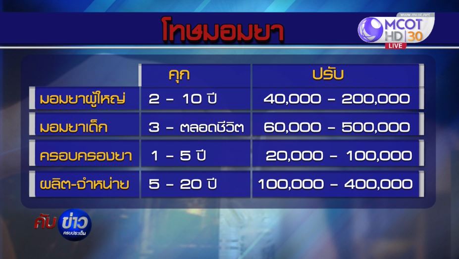 สำหรับข้อหาของผู้จูงใจ ชักนำ ยุยงส่งเสริม ใช้อุบายหลอกลวง หรือขู่เข็ญให้ผู้อื่นเสพหรือดื่มยา มีโทษจำคุก 2-10 ปี ปรับ 40,000-200,000 บาท หากกระทำต่อหญิงหรือต่อบุคคลซึ่งยังไม่บรรลุนิติภาวะ โทษจำคุก 3 ปี ถึงตลอดชีวิต ปรับ 60,000–500,000 บาท ผู้ครอบครองหรือใช้ประโยชน์ โทษจำคุก 1-5 ปี ปรับ 20,000–100,000 บาท และผู้ผลิต นำเข้า ส่งออก จำหน่าย โทษจำคุก 5-20 ปี ปรับ 100,000–400,000 บาท.-สำนักข่าวไทย