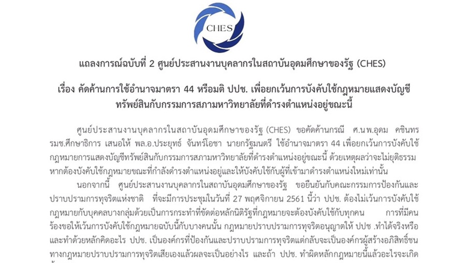 ขณะเดียวกัน ผู้สื่อข่าวรายงานว่าช่วงเช้าวันนี้ศูนย์ประสานงานบุคลากรในสถาบันอุดมศึกษาของรัฐ (CHES) ออกแถลงการณ์ฉบับที่ 2 เรื่อง คัดค้านการใช้อำนาจมาตรา 44 หรือมติคณะกรรมการป้องกันและปราบปรามการทุจริตแห่งชาติ (ป.ป.ช.) เพื่อยกเว้นการบังคับใช้กฎหมายแสดงบัญชีทรัพย์สินกับกรรมการสภามหาวิทยาลัยที่ดำรงตำแหน่งอยู่ขณะนี้ด้วยเหตุผลว่าจะไม่ยุติธรรม หากต้องบังคับใช้กฎหมายขณะที่กำลังดำรงตำแหน่งอยู่และให้บังคับใช้กับผู้ที่เข้ามาดำรงตำแหน่งใหม่เท่านั้น