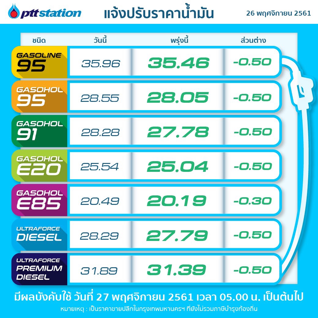 ปตท.-บางจากฯ แจ้งปรับลดราคาขายปลีกน้ำมันทุกชนิดลง 50 สตางค์ต่อลิตร ยกเว้น E85 ปรับลด 30 สตางค์ต่อลิตร มีผล 27 พฤศจิกายน 2561 เวลา 05.00 น. เป็นต้นไป โดยราคาขายปลีกเป็นดังนี้ เบนซิน 95 ลิตรละ 35.46 บาท แก๊สโซฮอล์ 95 ลิตรละ 28.05 บาท E20 ลิตรละ 25.04 บาท แก๊สโซฮอล์ 91 ลิตรละ 27.78 บาท E85 ลิตรละ 20.19 บาท ดีเซล 27.79 บาท และดีเซลพรีเมี่ยม 31.39 บาทต่อลิตร โดยราคาขายปลีกข้างต้นยังไม่รวมภาษีบำรุงกรุงเทพมหานคร.-สำนักข่าวไทย