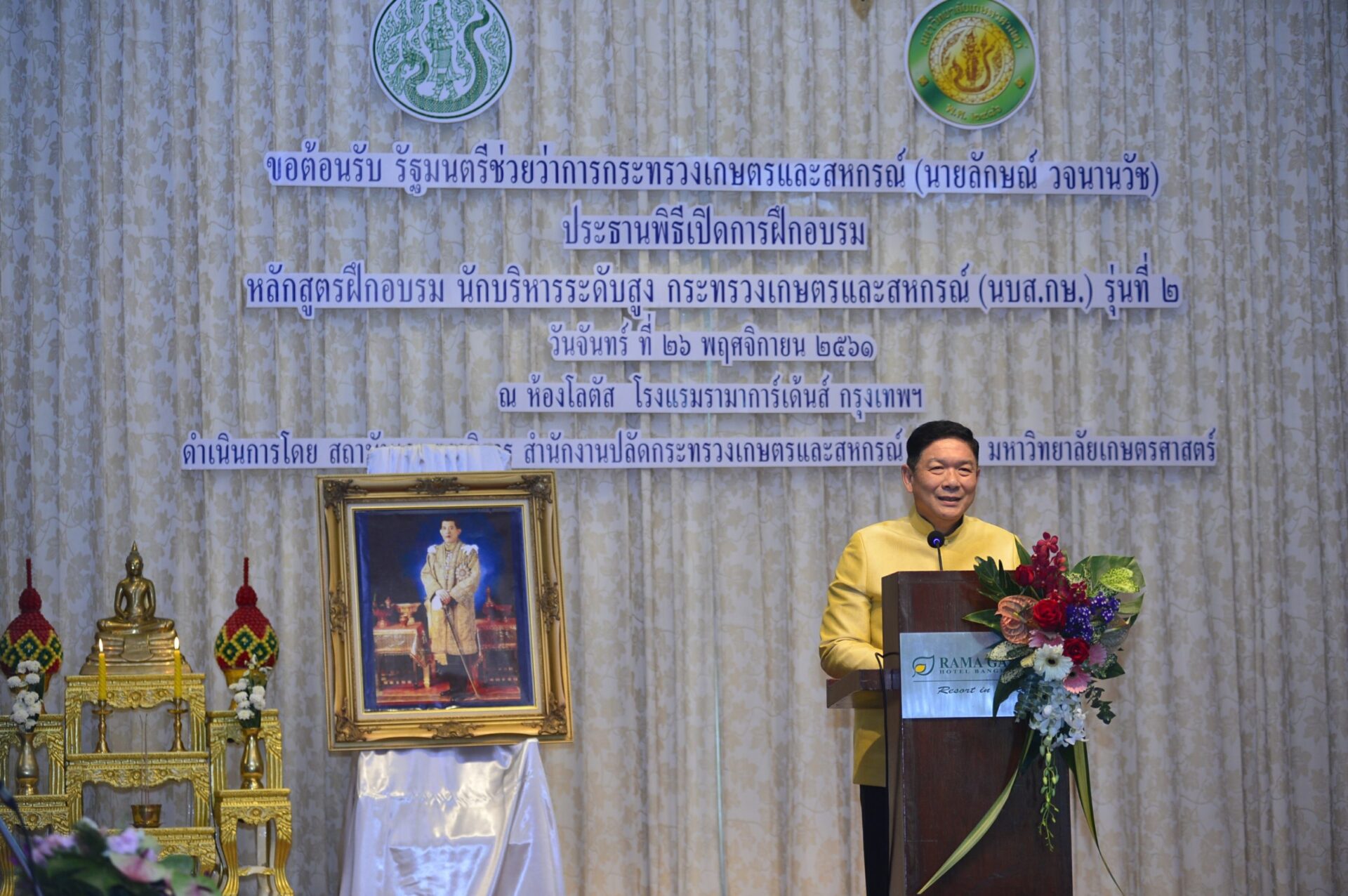รร.รามาการ์เด้นส์ 26 พ.ย. – รัฐมนตรีช่วยว่าการกระทรวงเกษตรและสหกรณ์ เปิดอบรมหลักสูตรนักบริหารระดับสูงของกระทรวงฯพร้อมมอบหลักคุณธรรม 3 ประการให้ผู้บริหารนำไปปฏิบัติ