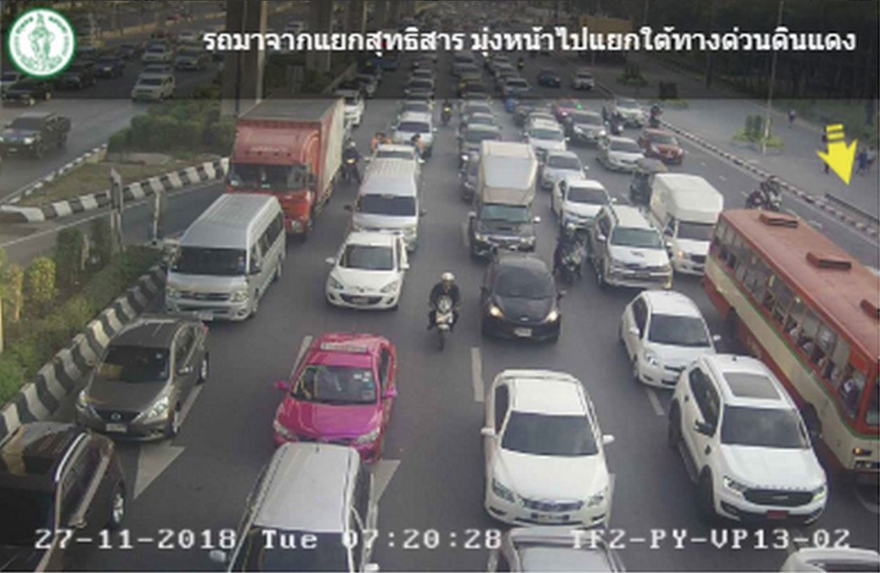 กทม. 27 พ.ย.-สวพ.FM 91 รายงานจราจรเช้าวันอังคาร ถนนวิภาวดี-รังสิต ขาเข้า มุ่งหน้าใต้ด่วนดินแดง การจราจรติดขัดมาก ท้ายสะสมหน้ามหาวิทยาลัยหอการค้าไทย