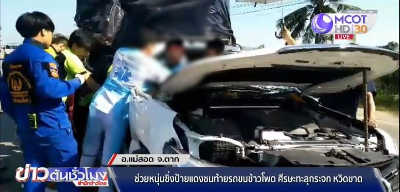 ตาก 27 พ.ย.- หนุ่มขับกระบะป้ายแดงชนท้ายรถบรรทุกหกล้อขนข้าวโพด บนถนนสายแม่สอด-อุ้มผาง เขต อ.แม่สอด จ.ตาก ศีรษะพุ่งทะลุกระจก คอไปค้างติดอยู่ด้านหน้า เจ้าหน้าที่ต้องใช้เครื่องตัดถ่างงัดซากรถ ใช้เวลา 20 นาที จึงนำตัวออกมาได้สำเร็จ