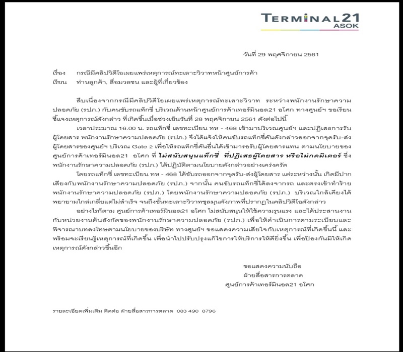 สืบเนื่องจากกรณีมีคลิปวิดีโอเผยแพร่เหตุการณ์ทะเลาะวิวาท ระหว่างพนักงานรักษาความปลอดภัย (รปภ.) กับคนขับรถแท็กซี่ บริเวณด้านหน้าศูนย์การค้าเทอร์มินอล 21 อโศก ทางศูนย์ฯ ขอเรียน ชี้แจงเหตุการณ์ดังกล่าว ที่เกิดขึ้นเมื่อช่วงเย็นวันที่ 28 พฤศจิกายน 2561 ดังต่อไปนี้