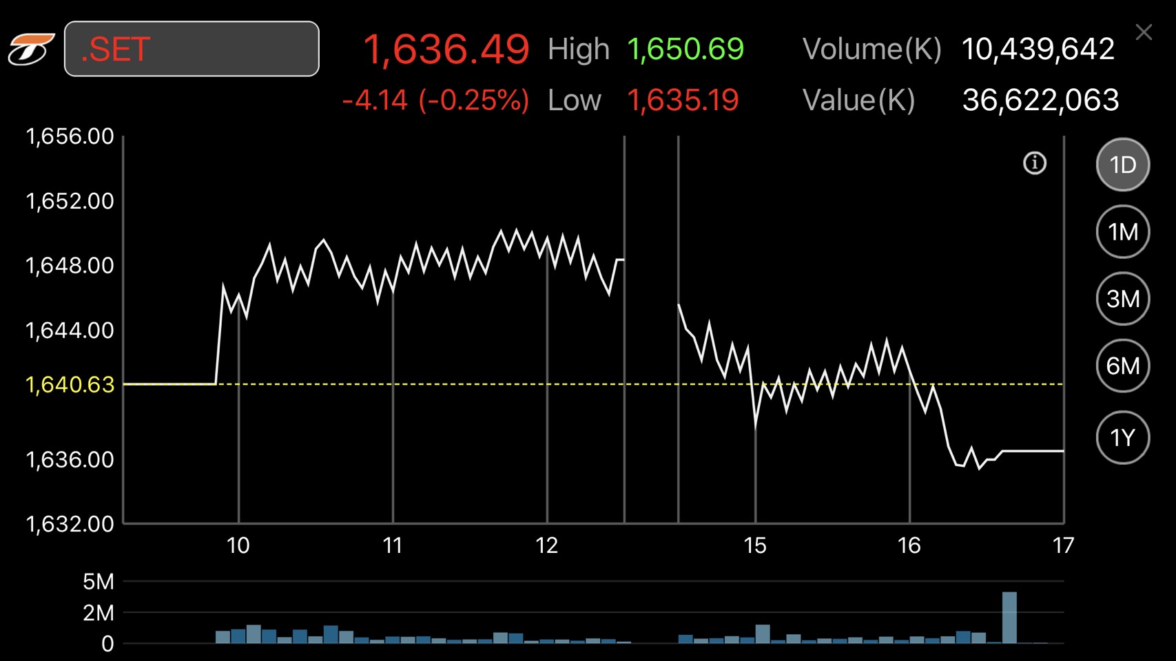 ผู้สื่อข่าวรายงานว่าตลาดหลักทรัพย์ฯ ปิดวันนี้ (29 พ.ย.) ที่ระดับ 1,636.49 จุด ลดลง 4.14 จุด หรือร้อยละ 0.25 มูลค่าการซื้อขาย 36,622.06 ล้านบาท การซื้อขายหุ้นวันนี้ดัชนีหุ้นไทยเคลื่อนไหวแดนบวกเป็นส่วนใหญ่ และพลิกกลับมาเคลื่อนไหวแดนลบช่วงท้ายตลาดภาคบ่าย โดยดัชนีฯ แตะจุดสูงสุดที่ 1,650.69 จุด และแตะจุดต่ำสุดที่ระดับ 1,635.19 จุด
