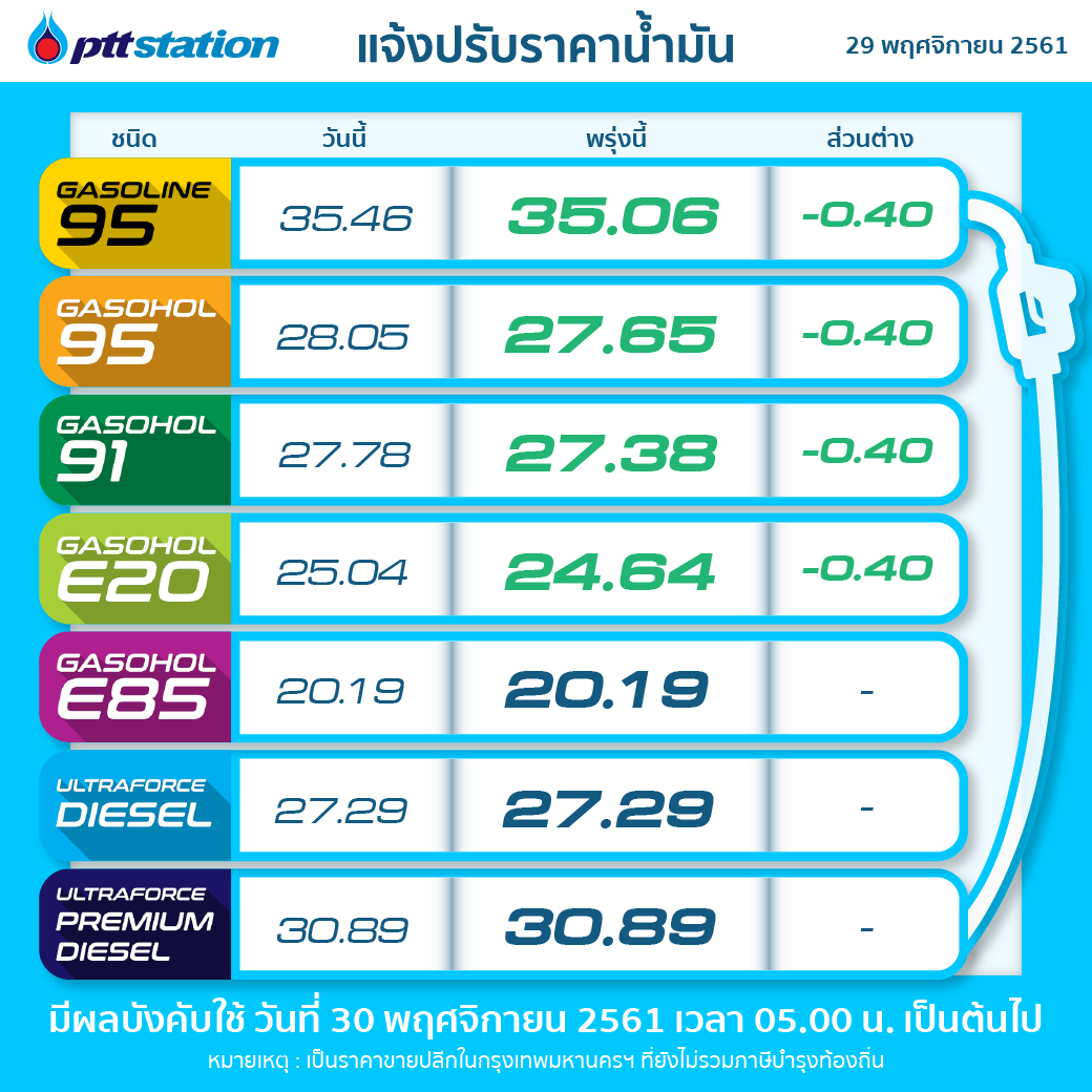 PTTOR และบางจากฯ ประกาศ ปรับลดราคาขายปลีกน้ำมันกลุ่มเบนซินและแก๊สโซฮอลล์ลง 0.40 บาทต่อลิตร ส่วน E85 และดีเซล ดีเซลพรีเมียม คงเดิม มีผล 30 พ.ย. 2561 เวลา 05.00 น. เป็นต้นไป โดยราคาขายปลีกจะเป็นดังนี้ เบนซิน 35.06 บาท/ลิตร,แก๊สโซฮอล์ 95 ราคา 27.65 บาท/ลิตร , อี 20 ราคา 24.64 บาท/ลิตร, แก๊สโซฮอล์ 91 ราคา 27.38 บาท/ลิตร, E85 ราคา 20.19 บาท/ลิตร, ดีเซล 27.29 บาท/ลิตร และ ดีเซลพรีเมี่ยม 30.89 บาทต่อลิตร โดยราคาขายปลีกข้างต้นยังไม่รวมภาษีบำรุงกรุงเทพมหานคร