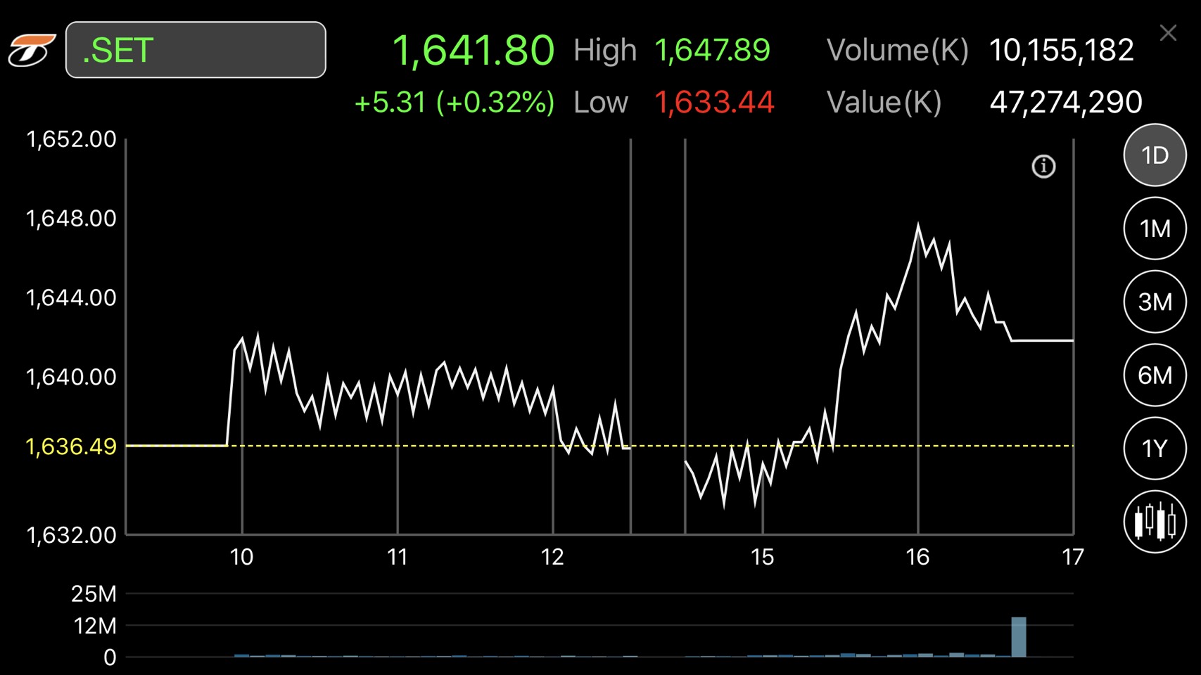 ผู้สื่อข่าวรายงานว่าตลาดหลักทรัพย์ฯ ปิดที่ระดับ 1,641.80 จุด บวก 5.31 จุด หรือร้อยละ 0.32 มูลค่าการซื้อขาย 47,271.48 ล้านบาท การซื้อขายหุ้นวันนี้ (30 พ.ย.) ดัชนีหุ้นไทยเคลื่อนไหวแดนบวกเป็นส่วนใหญ่ และดีดขึ้นช่วงท้ายตลาดภาคบ่าย โดยดัชนีฯ แตะจุดสูงสุดที่ 1,647.89 จุด และแตะจุดต่ำสุดที่ระดับ 1,633.44 จุด