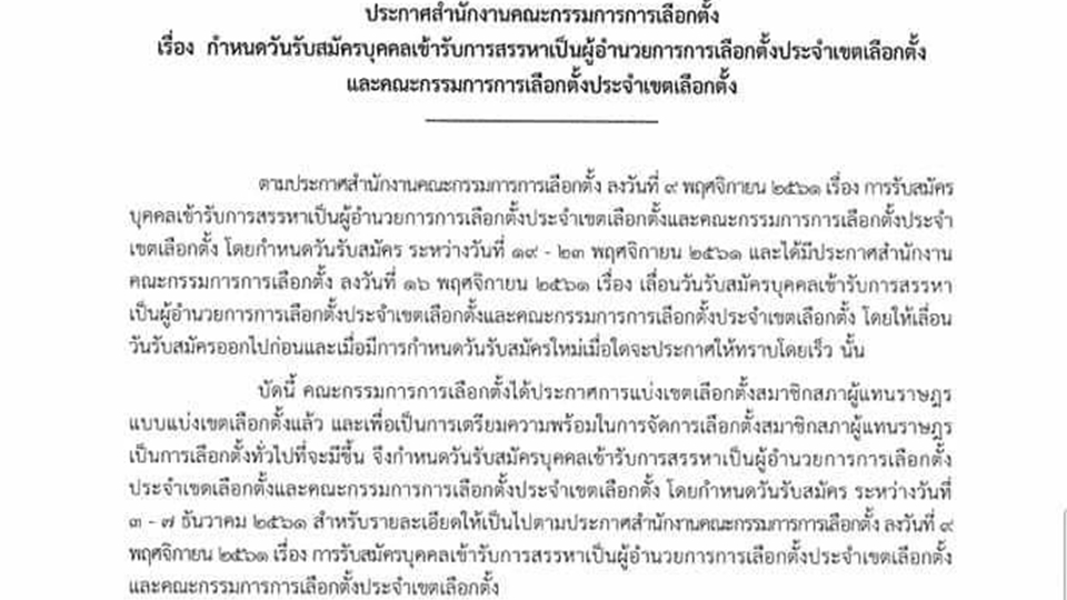 พ.ต.อ.จรุงวิทย์ ภุมมา เลขาธิการคณะกรรมการการเลือกตั้ง (กกต.) ลงนามในประกาศสำนักงานคณะกรรมการการเลือกตั้ง เรื่อง กำหนดวันรับสมัครบุคคลเข้ารับการสรรหาเป็นผู้อำนวยการเลือกตั้งประจำเขตเลือกตั้ง และคณะกรรมการการเลือกตั้งประจำเขตเลือกตั้งแล้วเมื่อวานนี้ (30 พ.ย.) โดยกำหนดวันรับสมัคร 3 – 7 ธันวาคม 2561 หลังจากที่มีการเลื่อนการรับสมัครในก่อนหน้านี้ ประกอบกับขณะนี้ กกต.ได้ประกาศแบ่งเขตเลือกตั้ง ส.ส.แบบแบ่งเขตแล้ว และเพื่อเป็นการเตรียมความพร้อมในการจัดการเลือกตั้ง ส.ส.ในการเลือกตั้งทั่วไปที่จะมีขึ้น