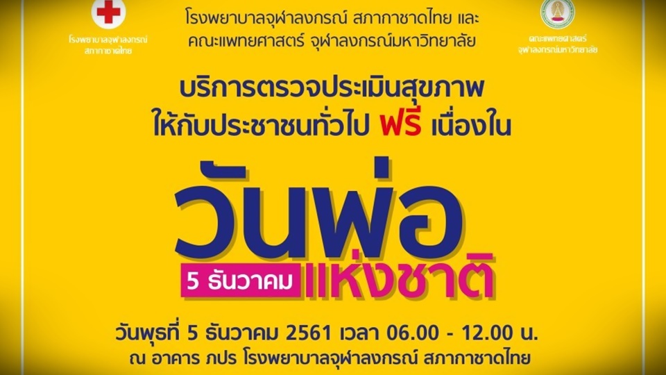 รพ.จุฬาฯ 3 ธ.ค.- วันพ่อแห่งชาติ 5 ธันวาคม รพ.จุฬาลงกรณ์ จัดบริการตรวจสุขภาพประชาชนฟรี