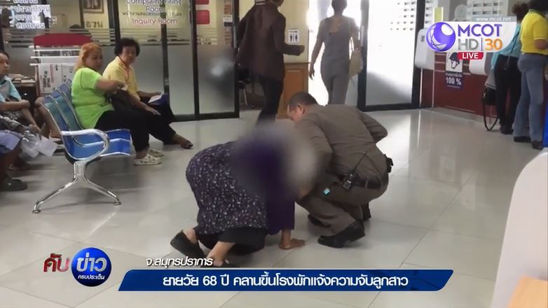 หญิงคนนี้ เปิดเผยกับผู้สื่อข่าวพอจับใจความได้ว่า สามีของคุณยายนอนป่วยเป็นอัมพาตรักษาตัวที่โรงพยาบาล ในวันนี้ไปที่โรงพยาบาลเพื่อขอรับตัวสามีกลับบ้าน แต่ลูกสาวได้ตามไปที่โรงพยาบาล และห้ามไม่ให้ตนเองพาสามีกลับบ้าน เพราะโรคอัมพาตกลับบ้านไปก็รักษาไม่หาย แต่ตนเองไม่ยอมทำให้ลูกสาวเกิดความไม่พอใจ และจับเหวี่ยงไปมาด้วยความรุนแรง จนเวียนศีรษะคล้ายความดันขึ้น จากนั้นลูกสาวก็หนีกลับบ้าน จึงมาแจ้งความให้ทางตำรวจช่วยจับลูกสาวมาดำเนินคดี ในข้อหาทำร้ายบุพการี