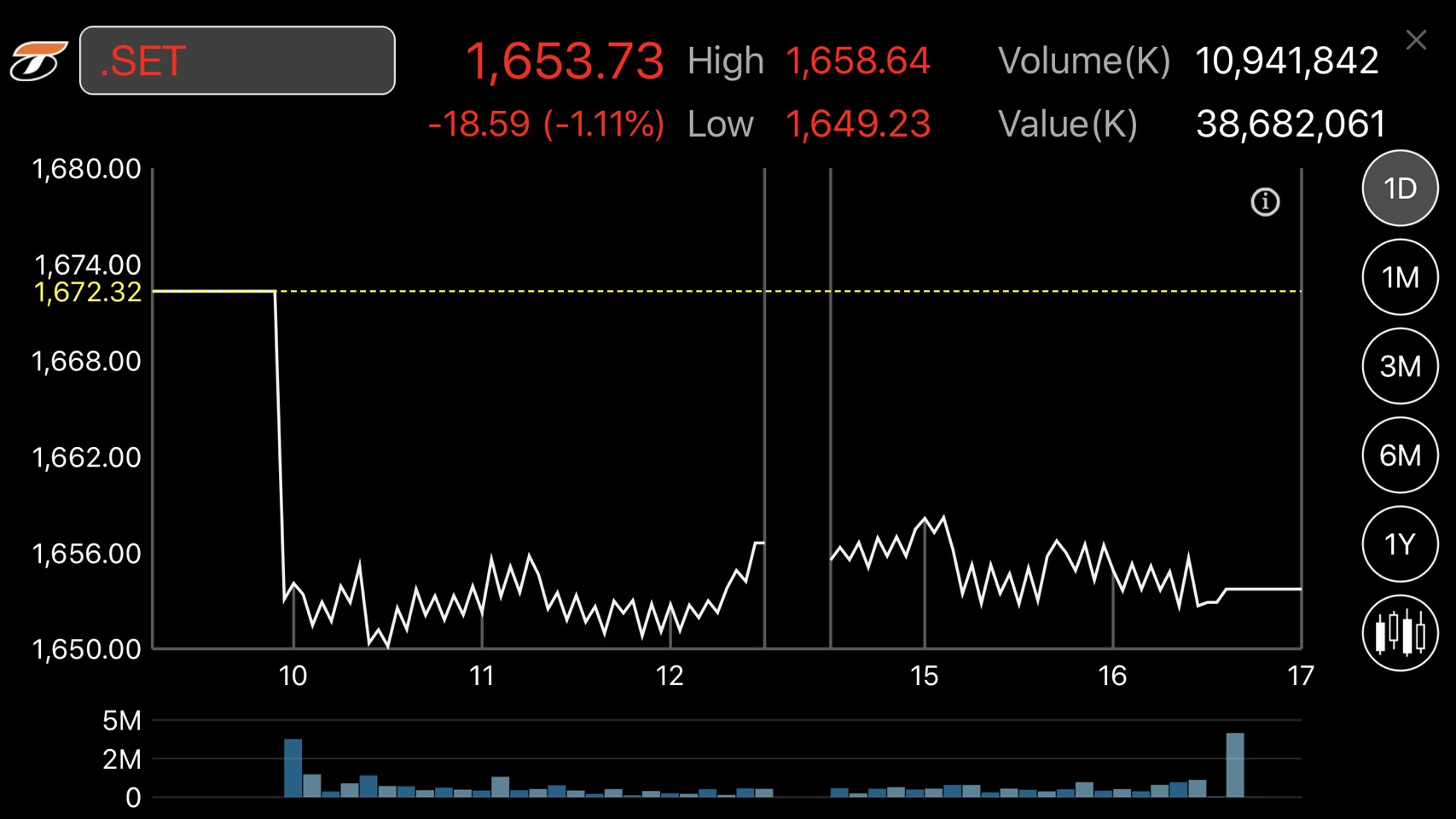 ผู้สื่อข่าวรายงานว่าตลาดหลักทรัพย์ฯ ปิดวันนี้ (6 ธ.ค.) ที่ระดับ 1,653.73 จุด ลดลง 18.59 จุด หรือร้อยละ 1.11 มูลค่าการซื้อขาย 38,682.06 ล้านบาท การซื้อขายหุ้นวันนี้ดัชนีเคลื่อนไหวแดนลบตลอดทั้งวัน โดยดัชนีฯ แตะจุดสูงสุดที่ 1,658.64 จุด และแตะจุดต่ำสุดที่ระดับ 1,649.23 จุด