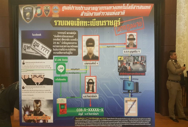 พลตำรวจโทสุรเชษฐ์ หักพาล ผู้บัญชาการสำนักงานตรวจคนเข้าเมือง เปิดเผยว่า หลังตำรวจได้รับเรื่องร้องเรียนว่ามีเฟซบุ๊ก ชื่อ “รับเช็คทะเบียนรถยนต์ ออนไลน์ เช็คอายัดรวดเร็ว 24 ชั่วโมง” มีการรับจ้างตรวจสอบข้อมูลและประวัติบุคคลผ่านออนไลน์ เพื่อการแสวงหาประโยชน์โดยไม่ชอบ ตำรวจจึงสืบสวนจนทราบว่า ขบวนการดังกล่าวมีผู้ร่วมกระทำความผิด 3 คน คือ ร้อยตำรวจโทบุญเสริม / นายทรงศักดิ์ และ นางสาวจินดารัตน์ ไม่เปิดเผยนามสกุล โดยผู้ต้องหาทั้งหมดมีการแบ่งหน้าที่กันทำ ทั้งเป็นผู้เช็คข้อมูลทางทะเบียนราษฏร์ และนำข้อมูลนั้นส่งต่อให้กับลูกค้า รวมถึงมีการประสานงานบริการกับลูกค้า โดยคิดค่าบริการในการตรวจสอบครั้งละ 1,000 บาท แต่หากลูกค้าต้องการข้อมูลเพิ่มเติมเกี่ยวกับรถยนต์ว่ามีกี่คัน หรือเคยแจ้งจดทะเบียนสมรสหรือไม่ จะต้องจ่ายเพิ่มอีก 1,000 บาท ซึ่งทั้งหมดเป็นการนำข้อมูลหน่วยงานราชการมาเปิดเผยในประการที่น่าจะก่อให้เกิดความเสียหายกับผู้อื่น ซึ่งมีความผิดตาม พ.ร.บ.การทะเบียนราษฎร พ.ศ. 2534