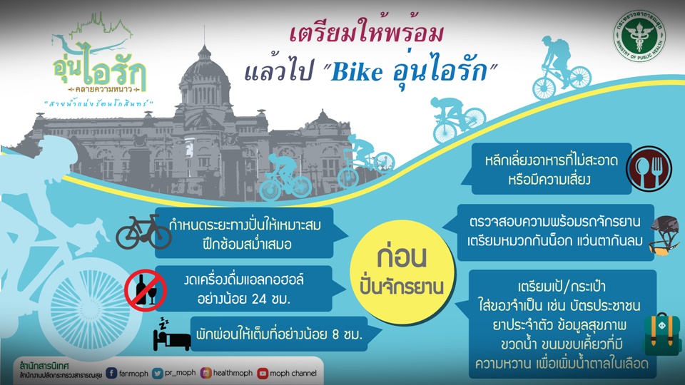 นพ.สุขุม กายจนพิมาย ปลัดกระทรวงสาธารณสุข ให้สัมภาษณ์ถึงการเตรียมความพร้อมร่างกายเพื่อเข้าร่วมกิจกรรม “Bike อุ่นไอรัก” ที่จะมีขึ้นในวันที่ 9 ธันวาคม 2561เนื่องในโอกาสเปิดงาน “อุ่นไอรัก คลายความหนาว สายน้ำแห่งรัตนโกสินทร์”ว่า ผู้ที่เข้าร่วมกิจกรรมในครั้งนี้ควรเตรียมความพร้อมก่อนปั่น ดูแลสุขภาพตนเองให้แข็งแรงที่สุด โดยเฉพาะประชาชนทั่วไปที่ไม่ได้ปั่นเป็นประจำ ผู้สูงอายุหรือผู้ที่มีโรคประจำตัวควรพบแพทย์เพื่อประเมินสุขภาพก่อนเข้าร่วมกิจกรรม