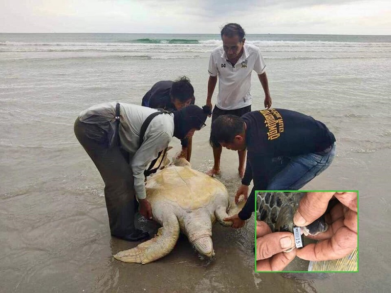 นายสมชาย ลิ่มสกุล ผู้ช่วยผู้ใหญ่บ้านดอนสำราญ หมู่ 2 ต.แม่รำพึง อ.บางสะพาน จ.ประจวบคีรีขันธ์ ได้รับแจ้งจากชาวประมงพบเต่าทะเลตัวใหญ่ติดอวนลอยอยู่บริเวณหน้าหาดดอนสำราญ จึงประสานอาสาสมัครพิทักษ์ชายหาดเร่งช่วยเหลือและใช้เชือกผูกอวนลากเข้ามาชายฝั่งพบว่าเต่าตนุ เพศเมีย น้ำหนักประมาณ 150 กิโลกรัม และที่เท้าหน้าด้านซ้ายมีแท็กโลหะแสดงหมายเลขกับตัวอักษรระบุว่าเป็นเต่าจากน่านน้ำประเทศมาเลเซีย