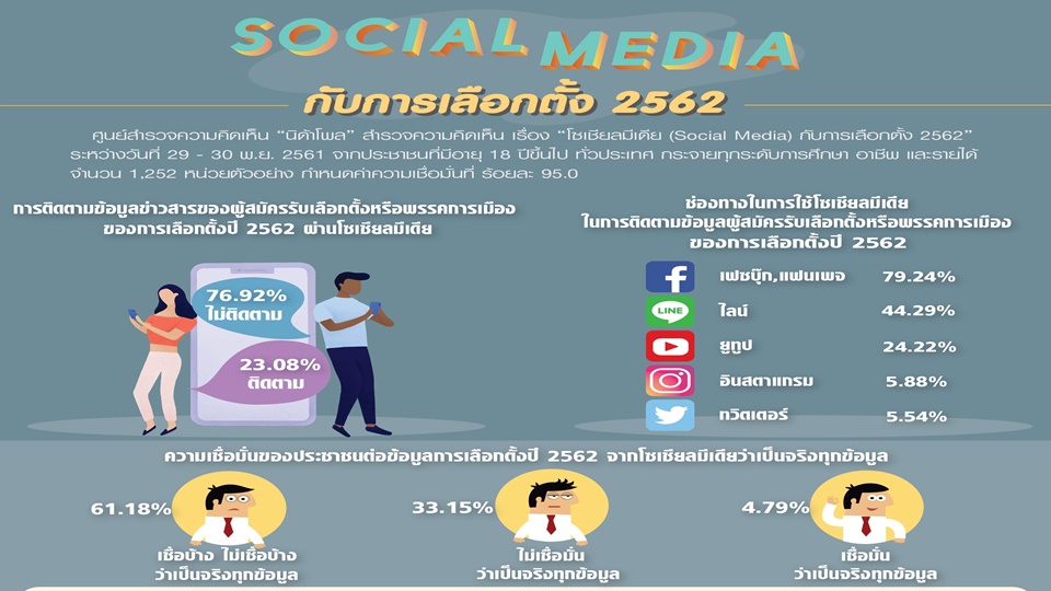 ศูนย์สำรวจความคิดเห็น “นิด้าโพล” สถาบันบัณฑิตพัฒนบริหารศาสตร์ (นิด้า) เปิดเผยผลสำรวจความคิดเห็นของประชาชน เรื่อง “โซเชียลมีเดีย (Social Media) กับการเลือกตั้งปี 2562” ซึ่งทำการสำรวจระหว่างวันที่ 29 – 30 พฤศจิกายน 2561 จากประชาชนที่ จำนวน 1,252 หน่วยตัวอย่าง เกี่ยวกับการใช้โซเชียลมีเดียของประชาชนในการติดตามข้อมูลข่าวสารการเลือกตั้งปี 2562 รวมถึงผลการใช้โซเชียลมีเดียกับการตัดสินใจในการเลือกผู้สมัครรับเลือกตั้ง และพรรคการเมือง พบว่า ประชาชนส่วนใหญ่ ร้อยละ 76.92 ไม่ได้ติดตามผ่านโซเชียลมีเดีย และร้อยละ 23.08 ระบุว่า ติดตามผ่านโซเชียลมีเดีย
