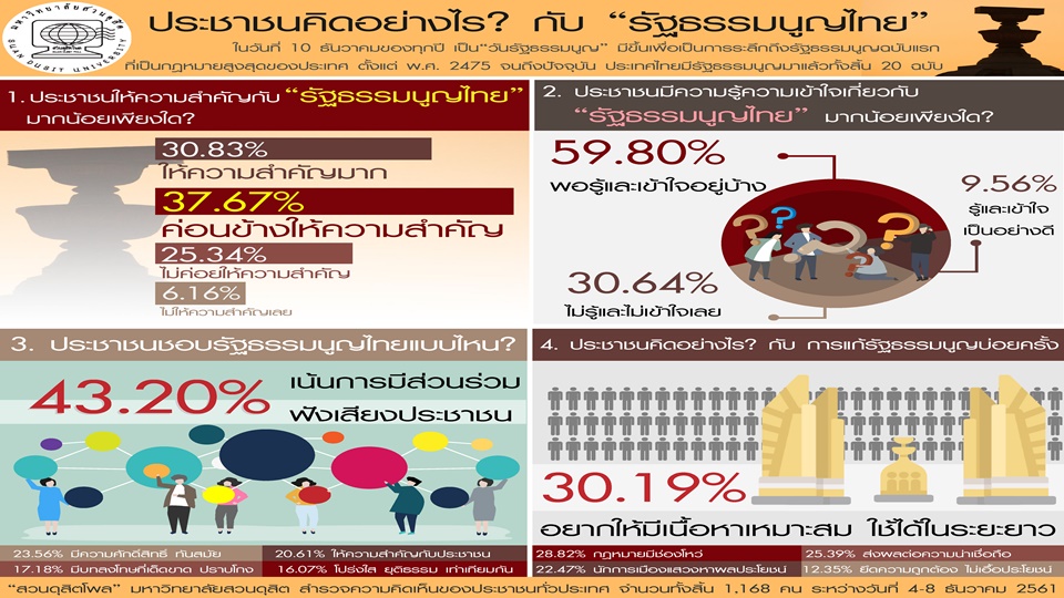 สวนดุสิตโพล มหาวิทยาลัยสวนดุสิต ได้สำรวจความคิดเห็นของประชาชนทั่วประเทศ จำนวนทั้งสิ้น 1,168 คน ระหว่างวันที่ 4-8 ธันวาคม 2561 ว่า ประชาชนคิดอย่างไร? กับ “รัฐธรรมนูญไทย”พบว่า ประชาชนส่วนใหญ่ ร้อยละ37.67ค่อนข้างให้ความสำคัญ เพราะเห็นว่าเป็นสิ่งที่จำเป็น ทุกคนควรรู้ มีความสำคัญต่อการพัฒนาประเทศทุกๆด้าน ทำให้บ้านเมืองสงบเรียบร้อย ฯลฯ ส่วนร้อยละ30.83 ให้ความสำคัญมากเพราะเป็นกฎหมายสูงสุดของประเทศ เกี่ยวข้องกับสิทธิเสรีภาพ มีผลต่อการเปลี่ยนแปลงทางการเมืองและประเทศชาติ ฯลฯ ร้อยละ 25.34ไม่ค่อยให้ความสำคัญ เพราะรัฐธรรมนูญเป็นเรื่องเข้าใจยาก มักถูกใช้เพื่อประโยชน์ของคนบางกลุ่ม โดยเฉพาะข้าราชการและนักการเมือง ฯลฯ ส่วนร้อยละ 6.16 ไม่ให้ความสำคัญเลย เพราะมีรัฐธรรมนูญมาแล้วหลายฉบับแต่ก็ยังเกิดความขัดแย้ง เปลี่ยนแปลงบ่อย ขึ้นอยู่กับจิตสำนึกมากกว่า ฯลฯ