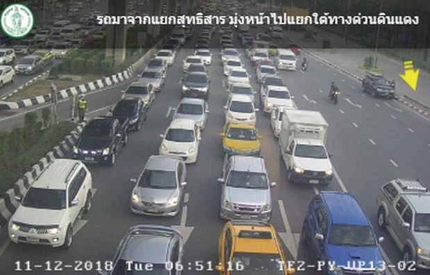 ถนนวิภาวดี-รังสิต เข้าแยกใต้ทางด่วนดินแดง รถหนาแน่น ติดเข้าอนุสาวรีย์ชัยฯ ท้ายสะสมหน้าโรงเรียนสุรศักดิ์มนตรี