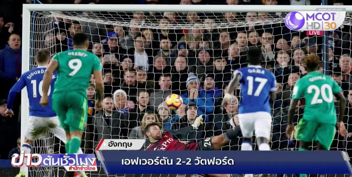 อังกฤษ 11 ธ.ค.-ฟุตบอลพรีเมียร์ลีก อังกฤษ นัดมันเดย์ไนท์ “ทอฟฟี่สีน้ำเงิน” เอฟเวอร์ตัน เปิดสนามกูดิสัน ปาร์ค เสมอกับ “แตนอาละวาด” วัตฟอร์ด 2 ประตูต่อ 2 โดยเจ้าถิ่นขึ้นนำไปก่อน 1ประตูต่อ 0 ตั้งแต่นาทีที่ 15 จาก ริชาร์ลิสัน แต่ทีมเยือนมายิง 2 ประตูรวด จาก ซีมุส โคลแมน ทำเข้าประตูตัวเอง นาที 63 และ อับดูลาย ดูคูเร่ โหม่งเข้าไปในนาที 65 ส่วนเอฟเวอร์ตัน เกืยบตีเสมอ แต่ กิลฟี ซิกูร์ดส์สัน ยิงจุดโทษไปติดเซฟของ เบน ฟอสเตอร์ ผู้รักษาประตู วัตฟอร์ด อย่างไรก็ตาม ลูกาส์ ดีญ มายิงฟรีคิกสุดสวยช่วยให้ เอฟเวอร์ตัน ไล่ตีเสมอ 2 ประตูต่อ 2 ในช่วงทดเจ็บ ได้สำเร็จ ทำให้ต้องแบ่งกันทีมละ 1 คะแนน โดย เอฟเวอร์ตัน มีเพิ่มเป็น 24 คะแนน จาก 16 นัด รั้งที่ 7 ของตาราง ทาง วัตฟอร์ด มีเพิ่มเป็น 21 คะแนนแข่งเท่ากัน รั้งที่ 12 ของตาราง.-สำนักข่าวไทย