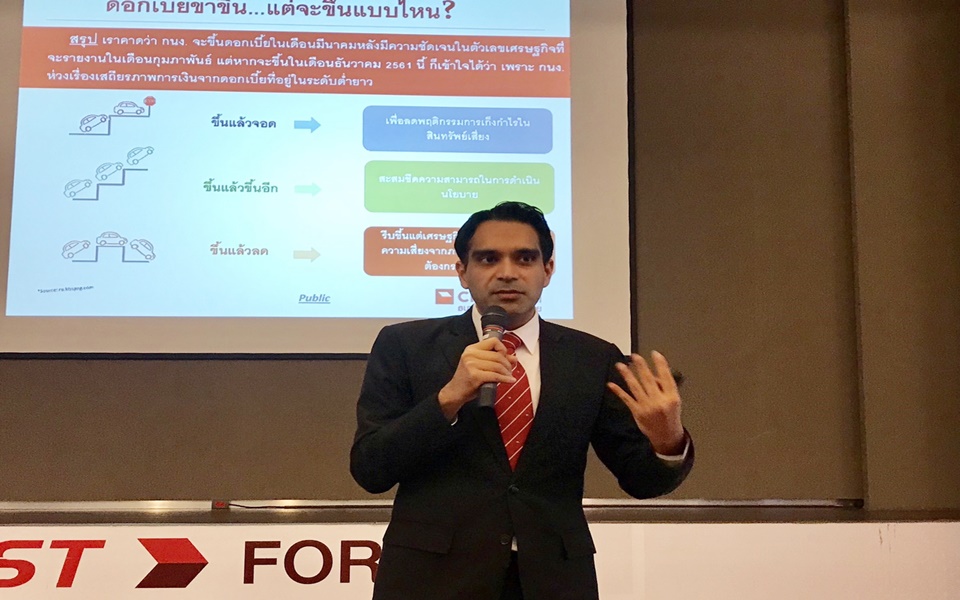 นายอมรเทพ จาวะลา ผู้บริหารสำนักวิจัยธนาคารซีไอเอ็มบี ไทย กล่าวว่า อัตราการขยายตัวทางเศรษฐกิจปี 2562 จะขยายตัวชะลอลงอยู่ที่ร้อยละ 3.7 จากปีนี้โตร้อยละ 4 เศรษฐกิจปีหน้าไม่มีพระเอก เพราะไม่มีเครื่องยนต์ตัวใดที่ขับเคลื่อนเศรษฐกิจอย่างเด่นชัด โดยจะต้องจับตาทิศทางทางการเมืองภายหลังการเลือกตั้งที่จะมีผลต่อเศรษฐกิจ และความเชื่อมั่นของนักลงทุน โดยเฉพาะประเด็นการจัดตั้งรัฐบาลและการคัดเลือกนายกรัฐมนตรี หลังรู้ผลการเลือกตั้งที่อาจจะต้องใช้เวลาหลายเดือนและอาจเป็นความเสี่ยงที่นักลงทุนต่างชาติชะลอการลงทุน เพื่อรอความชัดเจน เพราะนายกรัฐมนตรีอาจจะไม่สามารถจัดตั้งรัฐบาลเสียงข้างมากที่ได้รับการสนับสนุนจาก ส.ส.ได้ถึง 250 คนได้ ซึ่งรัฐบาลชุดใหม่อาจจะเผชิญความเสี่ยงในการผ่านร่างกฎหมายงบประมาณและการอภิปรายไม่ไว้วางใจ รวมทั้งยังมีความเสี่ยงของการที่รัฐบาลชุดใหม่จะสานต่อนโยบายเดิมของรัฐบาล พล.อ ประยุทธ์ จันทรโอชา ต่อไปหรือไม่ โดยเฉพาะการปฏิรูปเศรษฐกิจ การปฏิรูปการคลัง อุตสาหกรรม