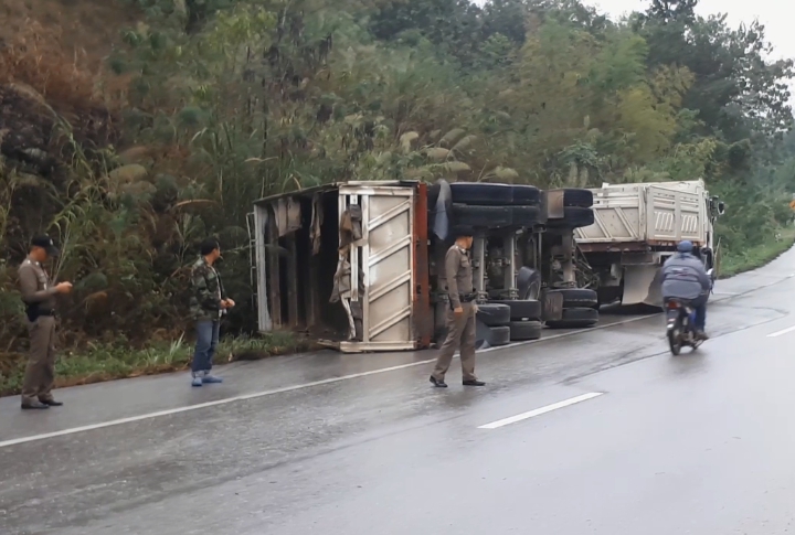 เมื่อเวลา 06.30 น. (12 ธ.ค.) เกิดอุบัติเหตุรถพ่วง 18 ล้อ เสียหลักพลิกตะแคงอยู่ริมถนนพหลโยธิน สายลำปาง-งาว-พะเยา หลักกิโลเมตรที่ 733 – 734 บ้านห้วยหลวง ม.15 ต.บ้านเสด็จ อ.เมือง จ.ลำปาง คนขับชื่อนายชวลิต ใจการ อายุ 34 ปี ไม่ได้รับบาดเจ็บ ให้การกับตำรวจ สภ.บ้านเสด็จ ว่า ขับมาจากจังหวัดพะเยามุ่งเข้าตัวเมืองลำปาง และมีฝนตกลงมาพอดี ประกอบกับเป็นทางโค้ง ทำให้ลูกพ่วงลื่นไถลก่อนพลิกตะแคงทั้งคัน