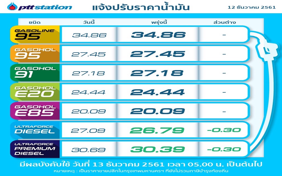 กรุงเทพฯ 12 ธ.ค. – ปตท.-บางจากฯ ลดดีเซล 30 สต./ลิตร ส่วนเบนซิน-แก๊สโซฮอล์ คงเดิม มีผล 13 ธ.ค.นี้