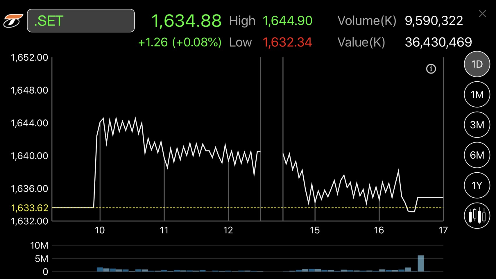 ผู้สื่อข่าวรายงานว่าดัชนีตลาดหลักทรัพย์ปิดวันนี้ (12 ธ.ค.) ที่ระดับ 1,634.88 จุด เพิ่มขึ้น 1.26 จุด หรือร้อยละ 0.08 มูลค่าการซื้อขาย 36,430.47 ล้านบาท การซื้อขายหุ้นวันนี้ดัชนีเคลื่อนไหวแดนบวกเป็นส่วนใหญ่ โดยดัชนีฯ แตะจุดสูงสุดที่ 1,644.90 จุด และแตะจุดต่ำสุดที่ระดับ 1,632.34 จุด