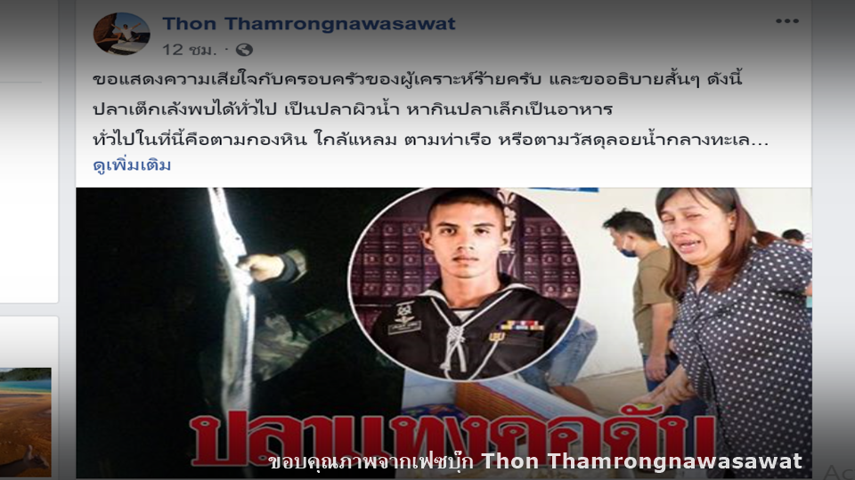 สำนักข่าวไทย 13 ธ.ค.-‘อ.ธรณ์’ นักวิชาการทางทะเล เผยปลาเต็กเล้งที่ปรากฏข่าวพุ่งชนลำคอทหารเรือเสียชีวิต ไม่ใช่ปลาดุร้ายหรือมีพิษ เป็นปลาขี้ตกใจ ตื่นกลัวคน คาดปลาตกใจจากจุดอื่น