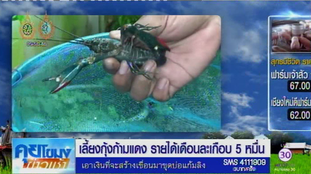 ส่วนอาหารให้กินพืชผักผลไม้ที่ปลอดสารพิษ เสริมด้วยไข่แดง และอาหารกุ้งเล็กน้อย ที่ผ่านมามีรายได้ประมาณ 40,000-50,000 บาท/เดือน จึงอยากให้เกษตรกรหันมาเลี้ยงกุ้งก้ามแดงกันมากขึ้น เพราะเลี้ยงง่าย ขายง่าย ได้กำไรดี