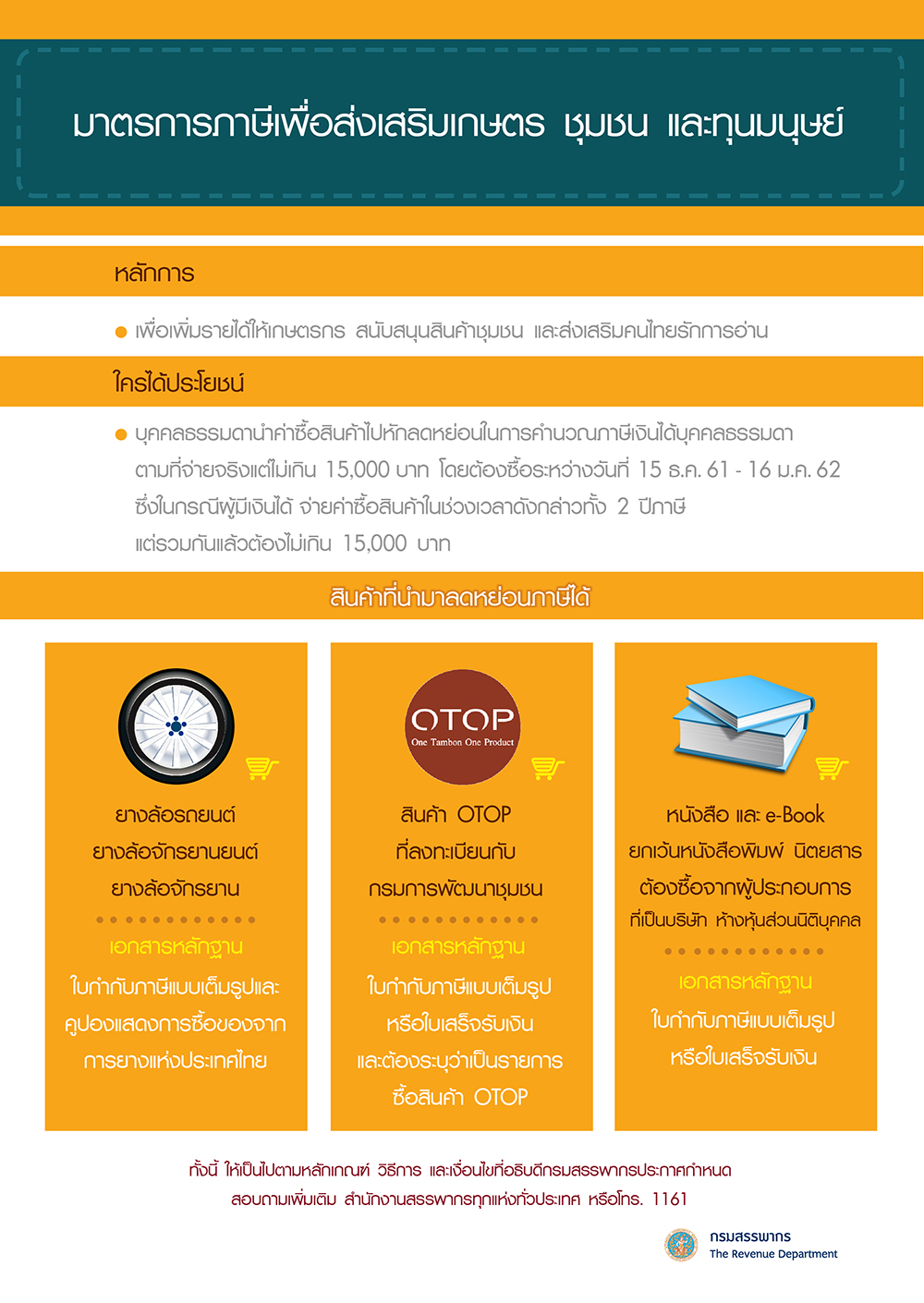 นายปิ่นสาย สุรัสวดี โฆษกกรมสรรพากร ได้ชี้แจงเพิ่มเติมเกี่ยวกับหลักฐานที่ใช้ในการหักลดหย่อนภาษีต้องมีการซื้อระหว่างวันที่ 15 ธันวาคม 2561 ถึงวันที่ 16 มกราคม 2562 วงเงินไม่เกิน 15,000 บาท สินค้า 3 ประเภท คือ 1. สินค้า OTOP ที่ได้ลงทะเบียนกับกรมการพัฒนาชุมชน จะต้องมีหลักฐานการซื้อสินค้า เป็นใบเสร็จรับเงิน (กรณีที่ผู้ขายสินค้าดังกล่าวไม่ได้เป็นผู้ประกอบการจดทะเบียนภาษีมูลค่าเพิ่ม) หรือใบกำกับ ภาษีแบบเต็มรูป (กรณีที่ผู้ขายสินค้าดังกล่าวเป็นผู้ประกอบการจดทะเบียนภาษีมูลค่าเพิ่ม)