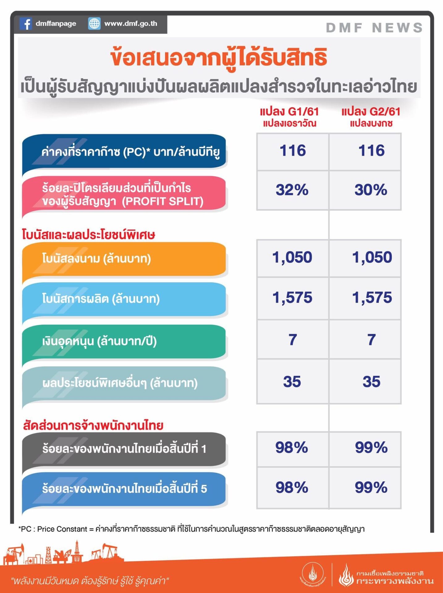 กรมเชื้อเพลิงธรรมชาติ รายงานว่า ภายหลังจากการประชุมคณะรัฐมนตรี ครั้งที่ 50/2561 ซึ่งมี พลเอก ประยุทธ์ จันทร์โอชา นายกรัฐมนตรี เป็นประธาน ได้มีมติอนุมัติให้ บริษัท ปตท.สผ. เอนเนอร์ยี่ ดีเวลลอปเมนท์ จำกัด ร่วมกับ บริษัท เอ็มพี จี2 (ประเทศไทย) จำกัด เป็นผู้ที่ได้รับสิทธิเป็นผู้รับสัญญาแบ่งปันผลผลิตแปลงสำรวจในทะเลอ่าวไทยหมายเลข G1/61 (แปลงเอราวัณ) และ บริษัท ปตท.สผ. เอนเนอร์ยี่ ดีเวลลอปเมนท์ จำกัด เป็นผู้ที่ได้รับสิทธิเป็นผู้รับสัญญาแบ่งปันผลผลิตแปลงสำรวจในทะเลอ่าวไทยหมายเลข G2/61 (แปลงบงกช)