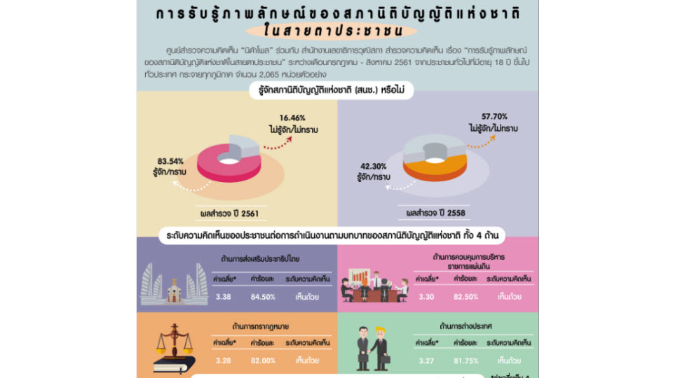 ทั้งนี้ พบว่า ผลสำรวจ ปี 2561 ประชาชนส่วนใหญ่รู้จักสภานิติบัญญัติแห่งชาติ (สนช.) สนช. ร้อยละ 83.54 และไม่รู้จัก ร้อยละ 16.46 ขณะที่ ผลสำรวจเมื่อปี 2558 พบว่า ประชาชนรู้จัก สนช. ร้อยละ 42.30 และไม่รู้จัก ร้อยละ 57.70 เมื่อเปรียบเทียบผลการสำรวจ พบว่า ในปี 2561 ประชาชนรู้จัก สนช. เพิ่มขึ้นมากกว่าปี 2558