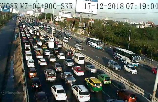 กทม. 17 ธ.ค.-สวพ.FM 91 รายงานจราจรเช้าวันจันทร์ ถนนพระราม9 ขาเข้า บนสะพานข้ามแยกรามคำแหง จราจรติดขัด ท้ายกระทบมอเตอร์เวย์(ทล.7) สะสมกม.7