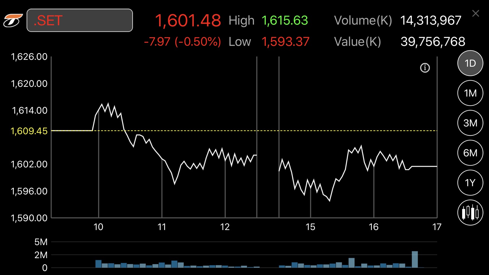 การซื้อขายหุ้นวันนี้ ดัชนีหุ้นไทยเคลื่อนไหวในแดนลบเป็นส่วนใหญ่ โดยดัชนีฯแตะจุดสูงสุดที่ 1,615.63 จุด และแตะจุดต่ำสุดที่ระดับ 1,593.37 จุด
