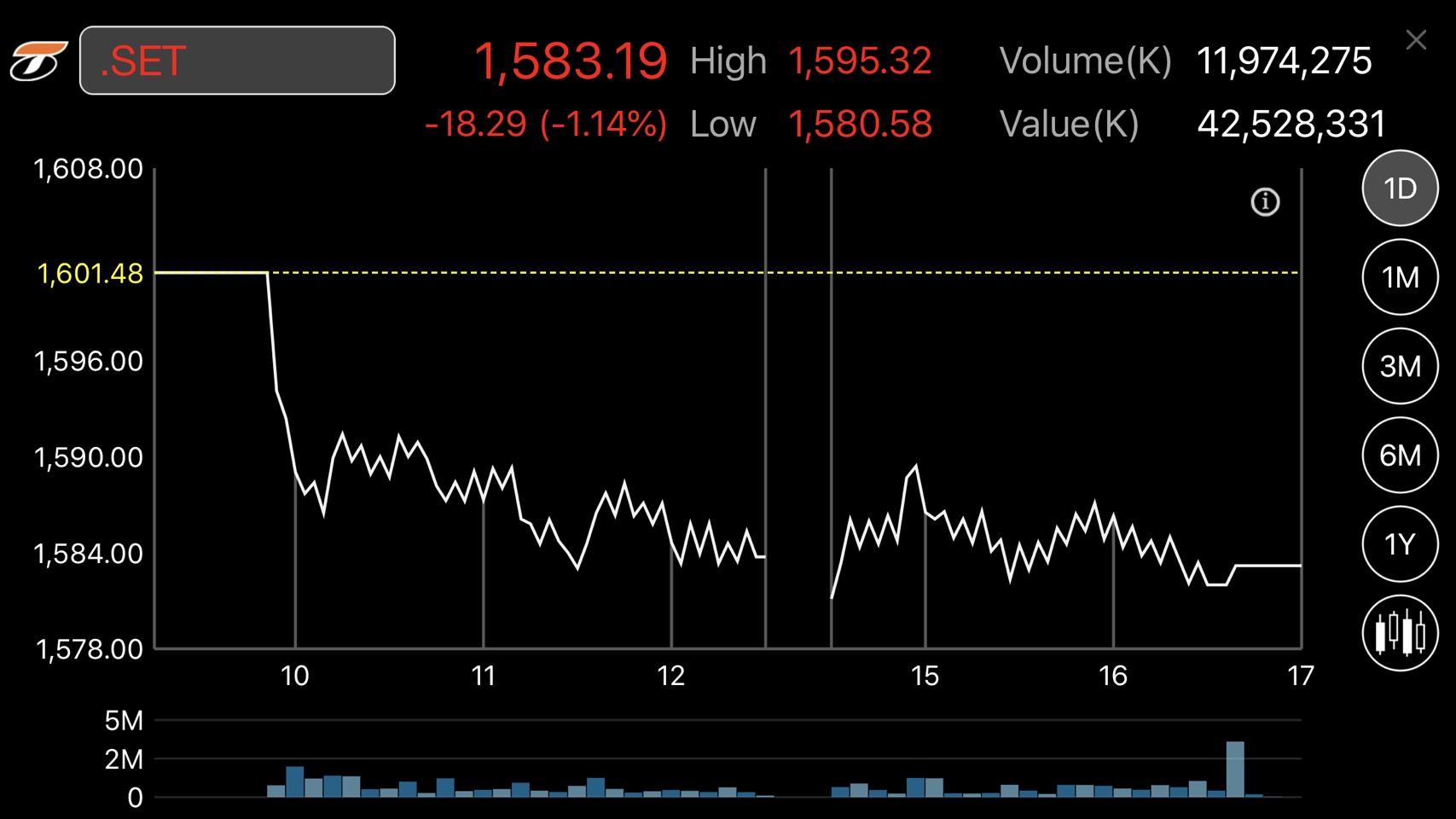 การซื้อขายหุ้นวันนี้ ดัชนีหุ้นไทยเคลื่อนไหวในแดนลบตลอดทั้งวัน โดยดัชนีฯแตะจุดสูงสุดที่ 1,595.32 จุด และแตะจุดต่ำสุดที่ระดับ 1,580.58 จุด