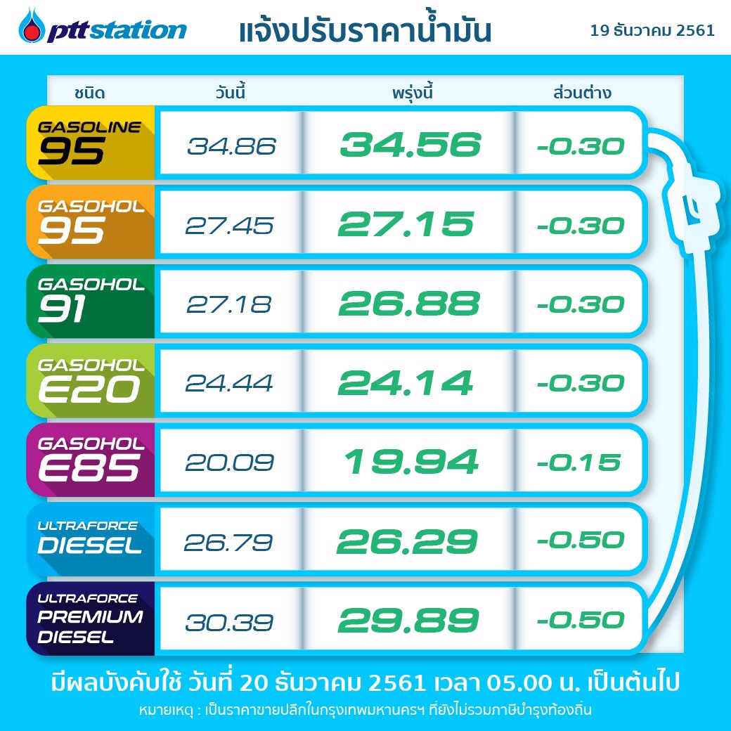 กรุงเทพฯ 19 ธ.ค. – ปตท.-บางจากฯ ลดเบนซินและแก๊สโซฮอลล์ 30 สต./ลิตร ส่วนดีเซลและดีเซลพรีเมียม ลด 50 สต./ลิตร มีผล 20 ธ.ค.นี้