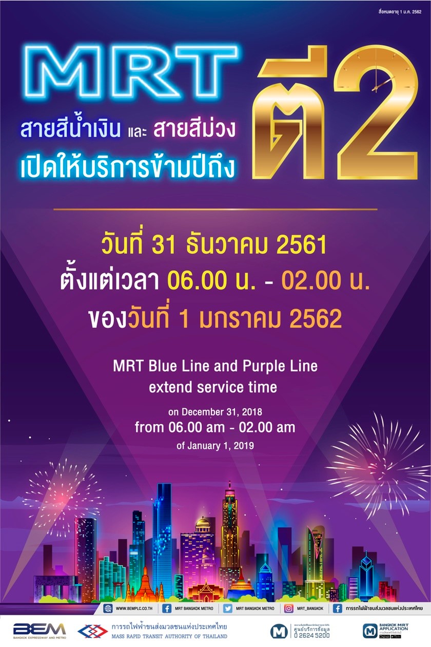 นายภคพงศ์ ศิริกันทรมาศ ผู้ว่าการการรถไฟฟ้าขนส่งมวลชนแห่งประเทศไทย (รฟม.) กล่าวว่า ตามที่กระทรวงคมนาคมมีนโยบายในการจัดเตรียมแผนอำนวยความสะดวกและความปลอดภัย รองรับการเดินทางของประชาชนในช่วงเทศกาลปีใหม่ 2562 นั้น รฟม. ได้จัดเตรียมแผนอำนวยความสะดวกเพื่อให้บริการแก่ประชาชนที่จะเดินทางไปร่วมเฉลิมฉลองเทศกาลปีใหม่ตามสถานที่ต่างๆ หรือเดินทางไปสวดมนต์ข้ามปี โดยจะขยายเวลาเปิดให้บริการเดินรถไฟฟ้าทั้ง 2 สาย ได้แก่ รถไฟฟ้ามหานคร สายเฉลิมรัชมงคล (รถไฟฟ้า MRT สายสีน้ำเงิน) และสายฉลองรัชธรรม (รถไฟฟ้า MRT สายสีม่วง) ตั้งแต่เวลา 06.00 น. ของวันที่ 31 ธันวาคม 2561 ถึงเวลา 02.00 น. ของวันที่ 1 มกราคม 2562 รวมถึงขยายเวลาให้บริการอาคารและลานจอดรถของรถไฟฟ้า MRT สายสีน้ำเงิน ทั้ง 8 แห่ง ได้แก่ อาคารจอดรถสถานีศูนย์วัฒนธรรมแห่งประเทศไทย อาคารจอดรถสถานีลาดพร้าว ลานจอดรถสถานีรัชดาภิเษก ลานจอดรถสถานีห้วยขวาง ลานจอดรถสถานีพระราม 9 ลานจอดรถสถานีเพชรบุรี ลานจอดรถสถานีศูนย์การประชุมแห่งชาติสิริกิติ์ ลานจอดรถสถานีสามย่าน อาคารจอดรถของรถไฟฟ้า MRT สายสีม่วงทั้ง 4 แห่ง ได้แก่ อาคารจอดรถสถานีคลองบางไผ่ อาคารจอดรถสถานีสามแยกบางใหญ่ อาคารจอดรถสถานีบางรักน้อยท่าอิฐ อาคารจอดรถสถานีแยกนนทบุรี 1 และลานจอดรถสถานีเคหะสมุทรปราการ ของโครงการรถไฟฟ้าสายสีเขียว ช่วงแบริ่ง-สมุทรปราการ ตั้งแต่เวลา 05.00 น. ของวันที่ 31 ธันวาคม 2561 ถึงเวลา 03.00 น. ของวันที่ 1 มกราคม 2562