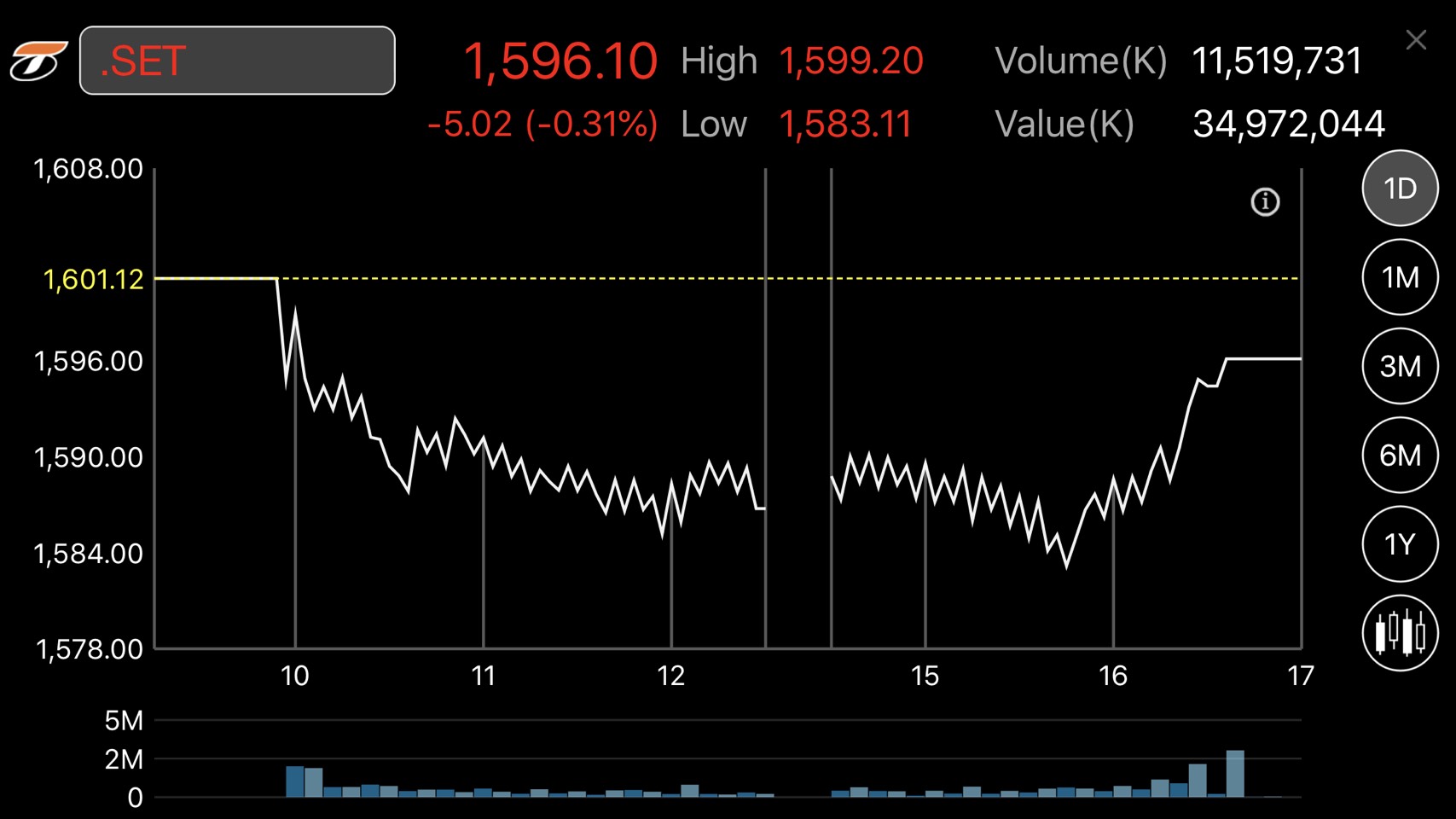 ตลาดหลักทรัพย์ปิดวันนี้ที่ระดับ 1,596.10 จุด ลดลง 5.02 จุด (-0.31%) มูลค่าการซื้อขาย 34,972.04 ล้านบาท