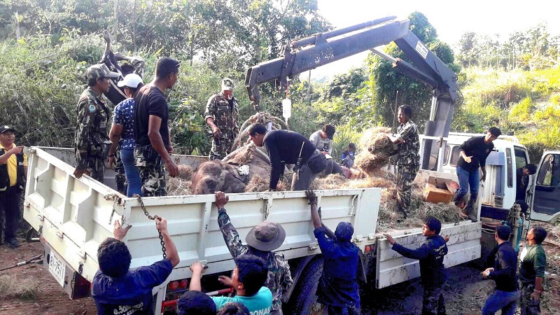 เมื่อเวลา 17.00 น. (20 ธ.ค.) นายสวัสดิ์ ทวีวัฒน์ ผู้อำนวยการสำนักบริหารพื้นที่อนุรักษ์ที่ 3 สาขาเพชรบุรี นายทัศเนศวร์ เพชรคง หัวหน้าอุทยานแห่งชาติกุยบุรี จ.ประจวบคีรีขันธ์ พร้อมชุดเจ้าหน้าที่นำรถบรรทุก 6 ล้อ ติดเครนเคลื่อนย้ายลูกช้างป่า เพศผู้ อายุ 5 ปี ได้รับบาดเจ็บที่ขาขวาจนยืนไม่ได้ นอนอยู่ใกล้ห้วยชายป่าหุบน้ำโจน หมู่ 6 บ้านเขาจ้าว อ.ปราณบุรี หลังเจ้าหน้าที่ตรวจป่ามาพบเมื่อวันที่ 18 ธ.ค.ที่ผ่านมา เพื่อนำมารักษาที่ศูนย์รักษาสัตว์ภายในอุทยานแห่งชาติกุยบุรี โดยมี ทหาร ฉก.จงอางศึกและฝ่ายปกครองเฝ้าสังเกตการณ์