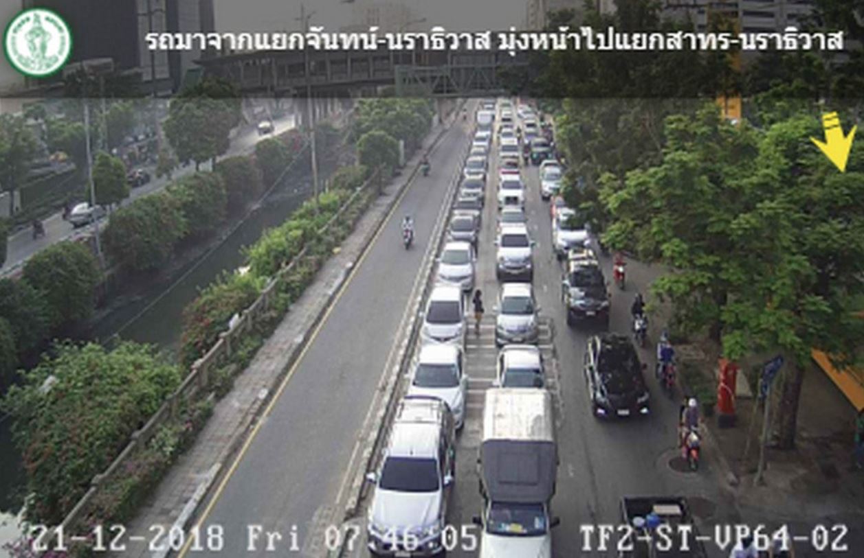 ถนนนราธิวาสราชนครินทร์ ขาเข้า มุ่งหน้าแยกนรินทร รถติดขัด ท้ายแถวสะสมอยู่ที่ปากซอยนราธิวาสฯ ซอย 10