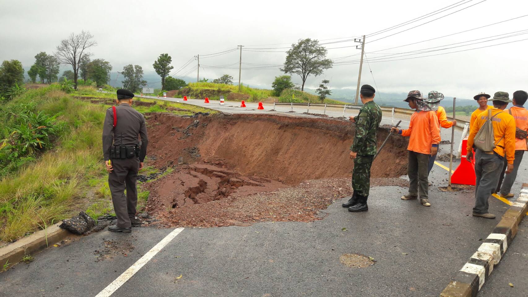 ช่วงสายวันนี้ (6 ก.ย.) หมวดการทางสันติสุข จ.น่าน นำเครื่องมืออุปกรณ์เข้าเคลียร์ถนนสายน้ำยาว-บ่อเกลือ และถนนหมายเลข 1081 ปัว-หลักลาย ซึ่งเป็นเส้นทางรอยต่อระหว่าง อ.สันติสุข กับ อ.บ่อเกลือ หลังจากฝนตกต่อเนื่อง ทำให้ดินทรุดตัวยาวประมาณ 750 เมตร เสียหาย 1 ช่องจราจร รถทุกชนิดสัญจรไม่ได้ และยังมีเสาไฟฟ้าล้มขวางถนน ต้องปิดการสัญจรชั่วคราว ขณะเดียวกัน กำลังทหารร่วมกับหน่วยงานที่เกี่ยวข้องเร่งช่วยเหลือชาวบ้านในพื้นที่น้ำท่วม หมู่ 10 บ้านใต้ร่มโพธิ์ทอง ต.งอบ อ.ทุ่งช้าง ระดับน้ำ 1.50 เมตร มีบ้านเรือนได้รับผลกระทบ 8 หลังคาเรือน ชาวบ้านอีกกว่า 30 ครัวเรือน เร่งขนย้ายทรัพย์สินมาไว้บนถนน เช่นเดียวกับบ้านดอนไชย หมู่ 6 ต.ป่าแลวหลวง อ.สันติสุข ถูกน้ำท่วมเช่นกัน