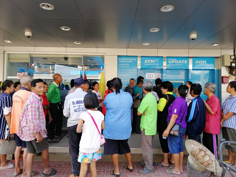 บรรยากาศเช้าวันนี้ตามตู้เอทีเอ็มของธนาคารกรุงไทย จังหวัดอุทัยธานี กลับมาหนาตาอีกครั้ง เช่น ธนาคารกรุงไทย สาขาหนองฉาง มีประชาชนที่ได้รับสิทธิรับเงิน 1,000 บาท นำบัตรมาเข้าแถวรอตั้งแต่เช้า เพื่อตรวจสอบยอดเงินและกดเงิน ซึ่งผู้ถือบัตรมีทั้งในพื้นที่และต่างอำเภอ คือ ทัพทัน ลานสัก และห้วยคต ทางเจ้าหน้าที่ธนาคารคอยอำนวยความสะดวกให้กับประชาชนที่มาใช้บริการกดเงินบัตรสวัสดิการแห่งรัฐจากตู้เอทีเอ็ม