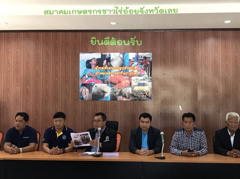 นายธีระชัย แสนแก้ว นายกสมาคมไร่อ้อยอีสานเหนือ–เอราวัณ และนายจีรพงศ์ ทันวงษา นายกสมาคมเกษตรกรชาวไร่อ้อยจังหวัดเลย พร้อมแกนนำชาวไร่อ้อยทั้ง 18 สมาคมในภาคอีสาน ร่วมแถลงที่สมาคมเกษตรกรชาวไร่อ้อย จังหวัดเลย อ.วังสะพุง วันนี้ (21 ธ.ค.) เรียกร้องอธิบดีกรมทางหลวงชนบทเร่งตรวจสอบข้อเท็จจริงกรณีหญิง อายุ 55 ปี ชาวบ้าน จ.หนองบัวลำภู เข้าแจ้งความที่ สภ.หนองหญ้าปล้อง อ.วังสะพุง เนื่องจากสามี อายุ 57 ปี คนขับรถบรรทุกอ้อย ซึ่งจอดรถพักข้างทางในพื้นที่ ต.หนองหญ้าปล้อง เพื่อรอนำอ้อยส่งโรงงาน เมื่อวันที่ 17 ธ.ค.ที่ผ่านมา ถูกกลุ่มชายประมาณ 8 คน แต่งกายคล้ายเจ้าหน้าที่กรมทางหลวงชนบทเข้ามาข่มขู่ ทำให้สามีตกใจวิ่งหนีเข้าไปในไร่อ้อยเกือบ 2 กิโลเมตร เมื่อกลุ่มชายดังกล่าวตามมาทันจึงลงมือทำร้ายร่างกาย และถูกส่งตัวมารักษาที่โรงพยาบาลเอราวัณ แพทย์พบว่าอาการสาหัสจึงส่งไปรักษาต่อที่โรงพยาบาลเมืองเลย ตรวจพบซี่โครงหัก ตามร่างกายเขียวช้ำ ศีรษะบวมอาจกระเทือนถึงสมอง