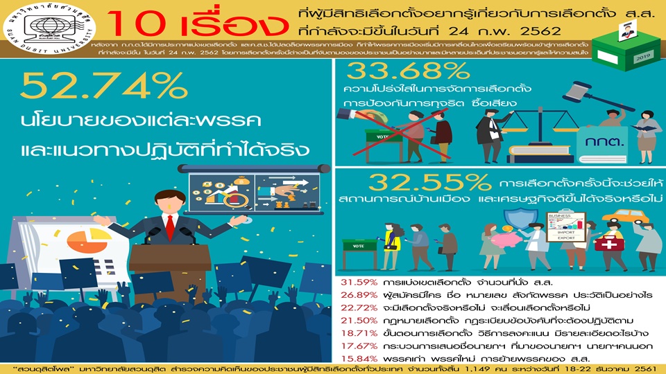 หลังจาก ก.ก.ต.ได้มีการประกาศแบ่งเขตเลือกตั้ง และค.ส.ช.ได้ปลดล็อคพรรคการเมือง ก็ทำให้พรรคการเมืองเริ่มมีการเคลื่อนไหวเพื่อเตรียมพร้อมเข้าสู่การเลือกตั้งที่กำลังจะมีขึ้นในวันที่ 24 ก.พ. 2562 โดยการเลือกตั้งครั้งนี้ต่างเป็นที่จับตามองของประชาชนเป็นอย่างมากและมีหลายประเด็นที่ประชาชนอยากรู้และให้ความสนใจ เพื่อเป็นการสะท้อนความคิดเห็นของประชาชนที่มีต่อเรื่องที่ประชาชนอยากรู้เกี่ยวกับการเลือกตั้ง “สวนดุสิตโพล” มหาวิทยาลัยสวนดุสิต จึงได้สำรวจความคิดเห็นของประชาชนผู้มีสิทธิเลือกตั้งทั่วประเทศ จำนวนทั้งสิ้น 1,149 คน ระหว่างวันที่ 18-22 ธันวาคม 2561 สรุปผลได้ ดังนี้