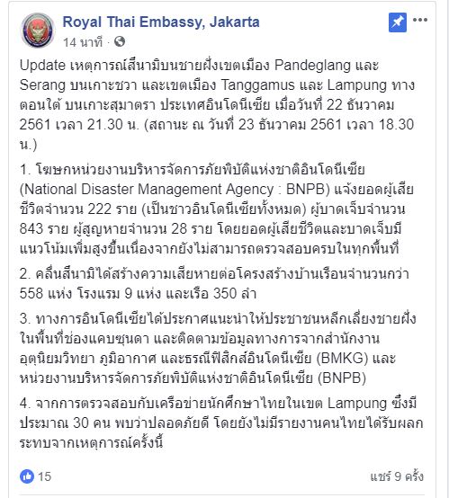 สถานเอกอัครราชทูตไทย ณ กรุงจาการ์ตา รายงานเหตุการณ์สึนามิบนชายฝั่งเขตเมือง Pandeglang และ Serang บนเกาะชวา และเขตเมือง Tanggamus และ Lampung ทางตอนใต้ บนเกาะสุมาตรา ประเทศอินโดนีเซีย เมื่อวันที่ 22 ธันวาคม 2561 เวลา 21.30 น. (สถานะ ณ วันที่ 23 ธันวาคม 2561 เวลา 18.30 น.)